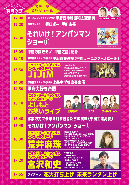 市内の幼稚園児や中高生によるパフォーマンス、それいけ!アンパンマンショー、甲府市出身のメンバーがいるJIJIMのステージが会場を盛り上げます。