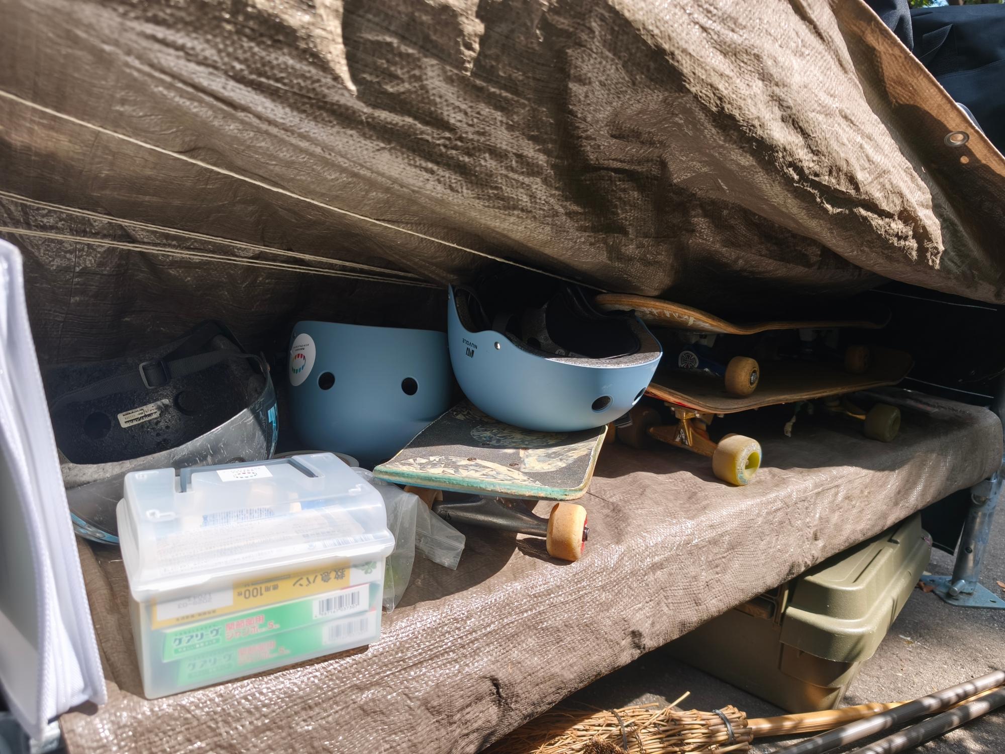 スケートボードとヘルメット、虫よけスプレー、救急セット、ダンスマットがあります。