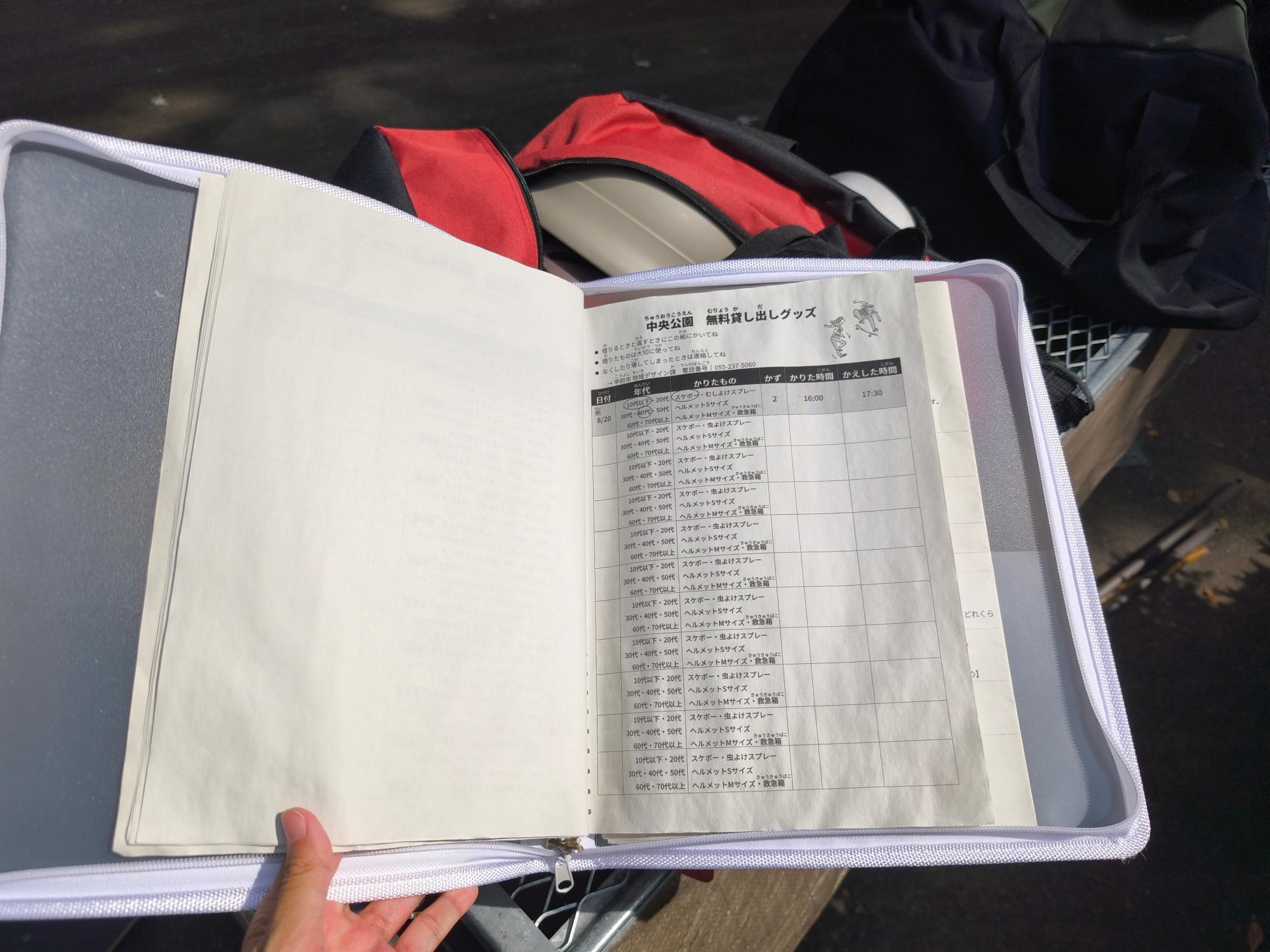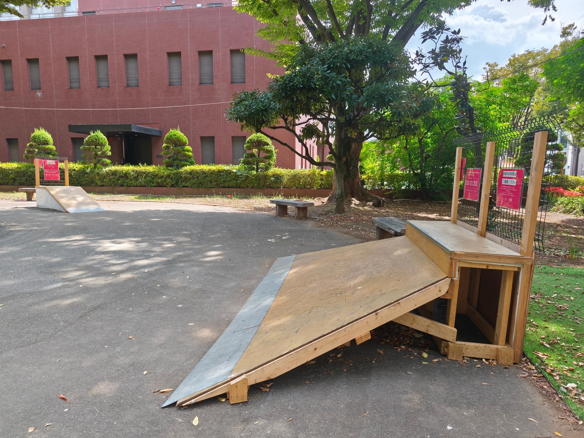 中央公園は平らで広いアスファルトがある公園で、11月までの期間限定となりますが、スケートボードの練習に使える坂も常置されています。